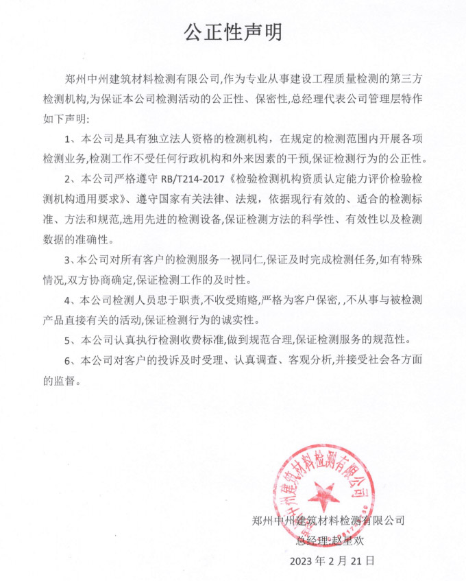通過河南省質(zhì)量技術監(jiān)督局計量認證、河南省住房和城鄉(xiāng)建設廳批準,具有獨立法人資格的第三方檢測機構(gòu)。